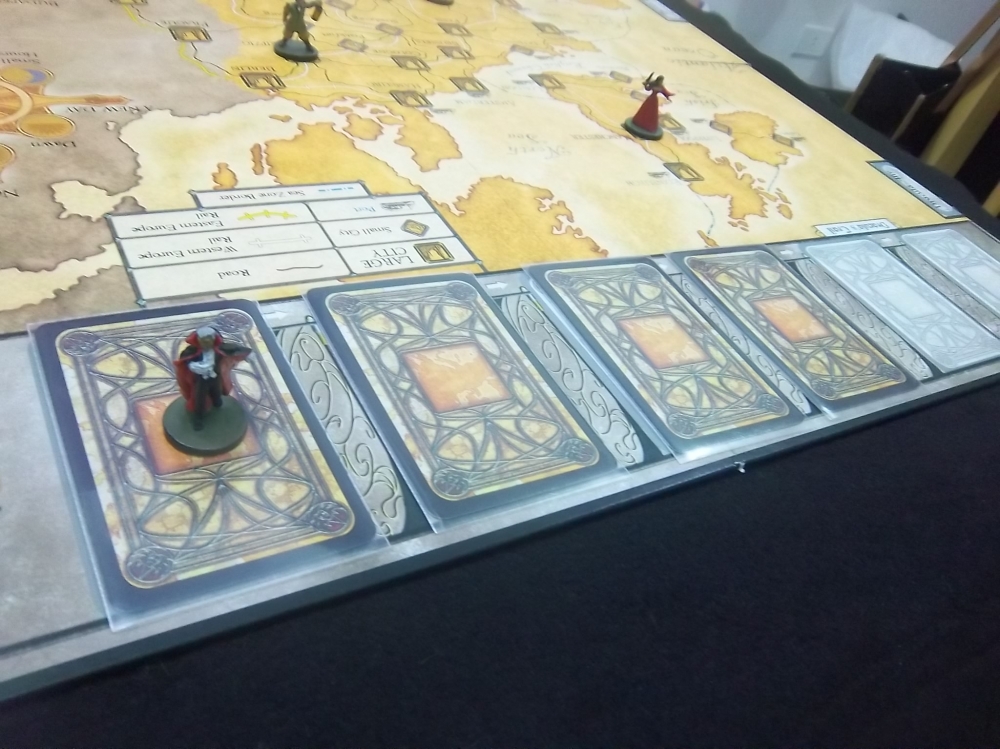 Drácula e seus CARTA DE LOCALIZAÇÃO. Ele possui um deck com todas as cidades contidas no mapa e pode se deslocar para qualquer uma delas (escondido, é claro). Fury of Dracula (second edition)