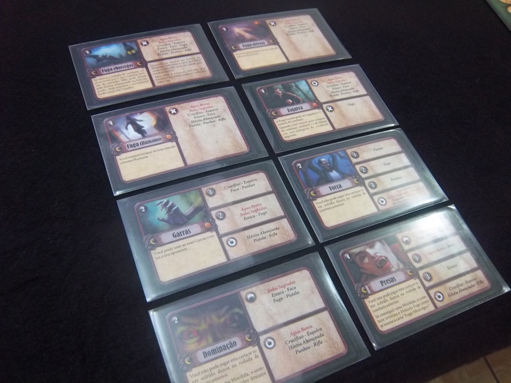 Aqui as CARTAS DE COMBATE do Drácula (caso algum caçador o encontre). Durante o dia ele só usa as "básicas", mas a noite ele tem todas as disposição. Fury of Dracula (second edition)