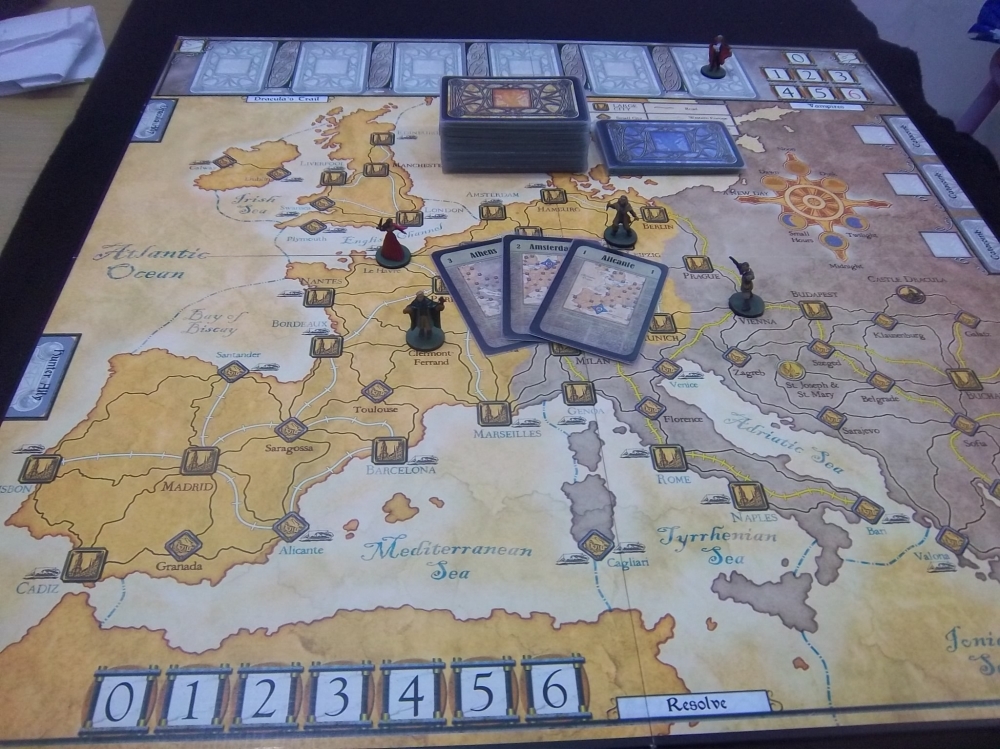 O tabuleiro completo com todas as miniaturas (pintadas). A parte mais amarela é o OESTE EUROPEU. A região mais escura é o LESTE (usar ferrovias aqui é mais danoso, devido a péssima qualidade delas na época em que o jogo é narrado). Fury of Dracula (second edition)