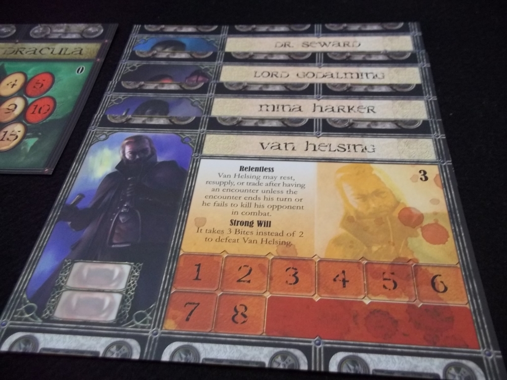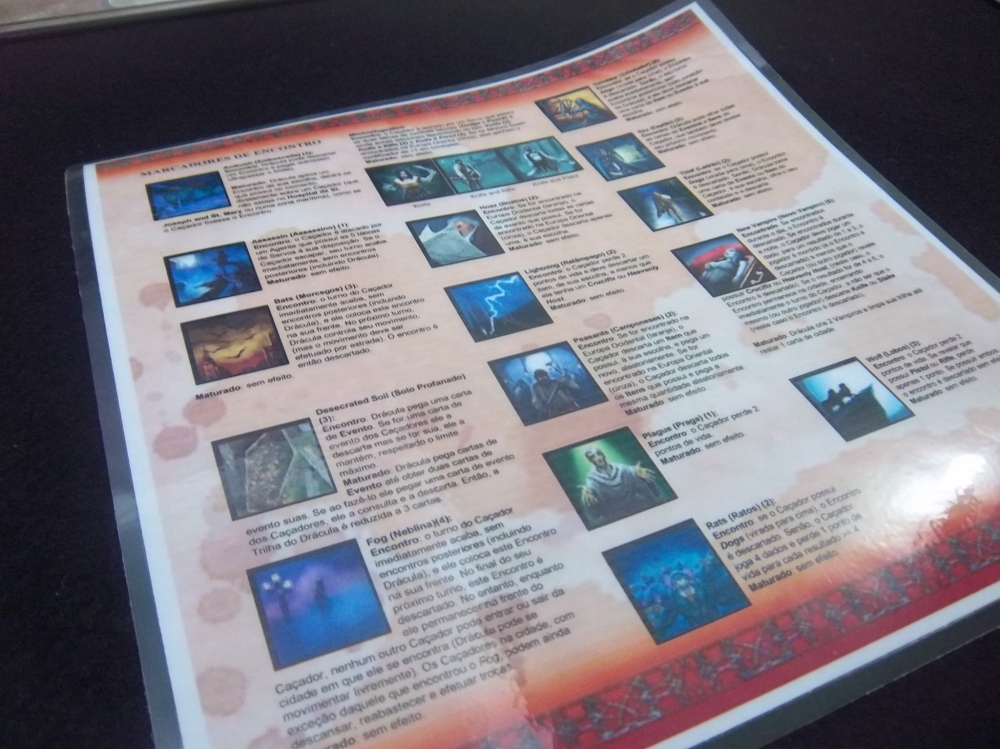 Ficha do Drácula e todas as suas carta de poder, além de seus marcadores de ENCONTRO (a direita), que ele usa para tornar a vida dos caçadores menos "monótona". Os poderes dele são muito interessantes e acrescentam MUITA estratégia ao jogo. Fury of Dracula (second edition)