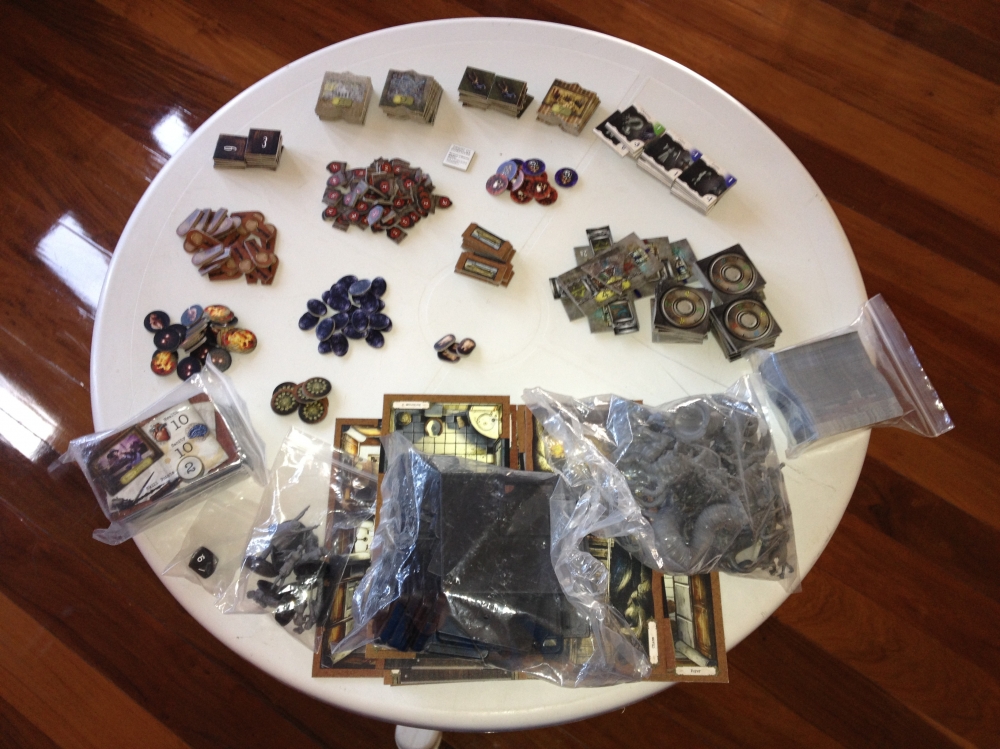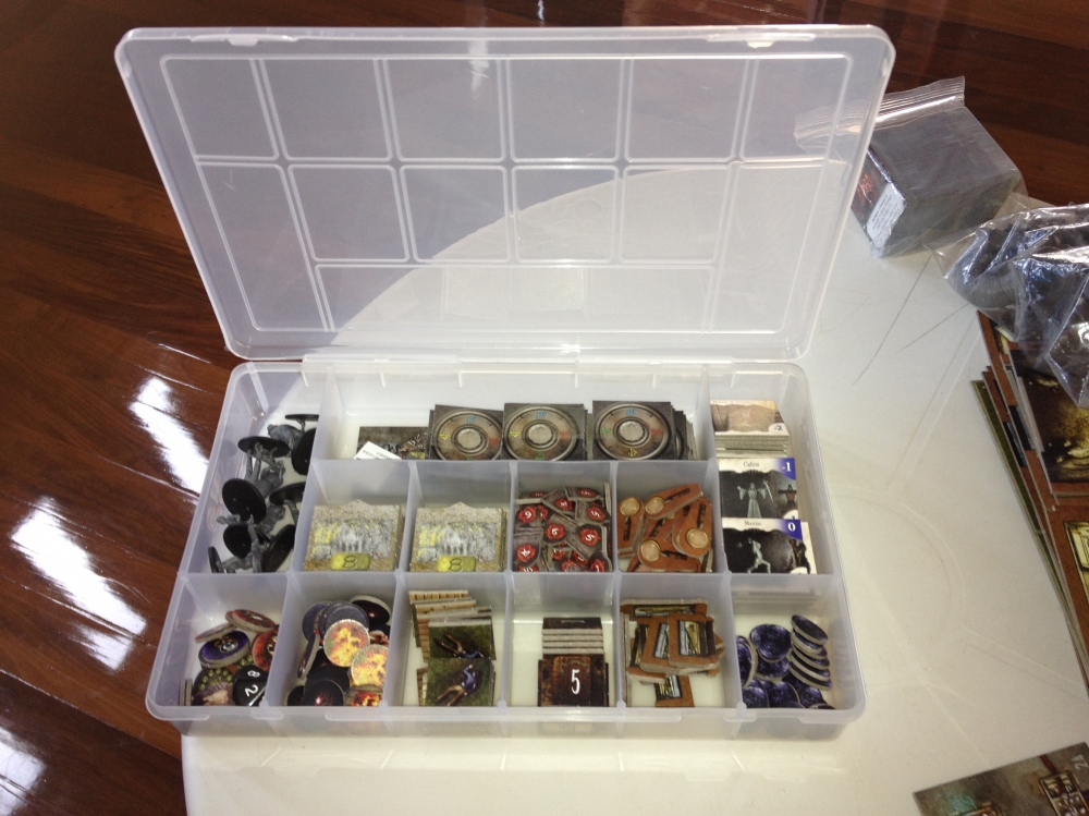 Caixa organizadora com a maioria dos componentes Mansions of Madness