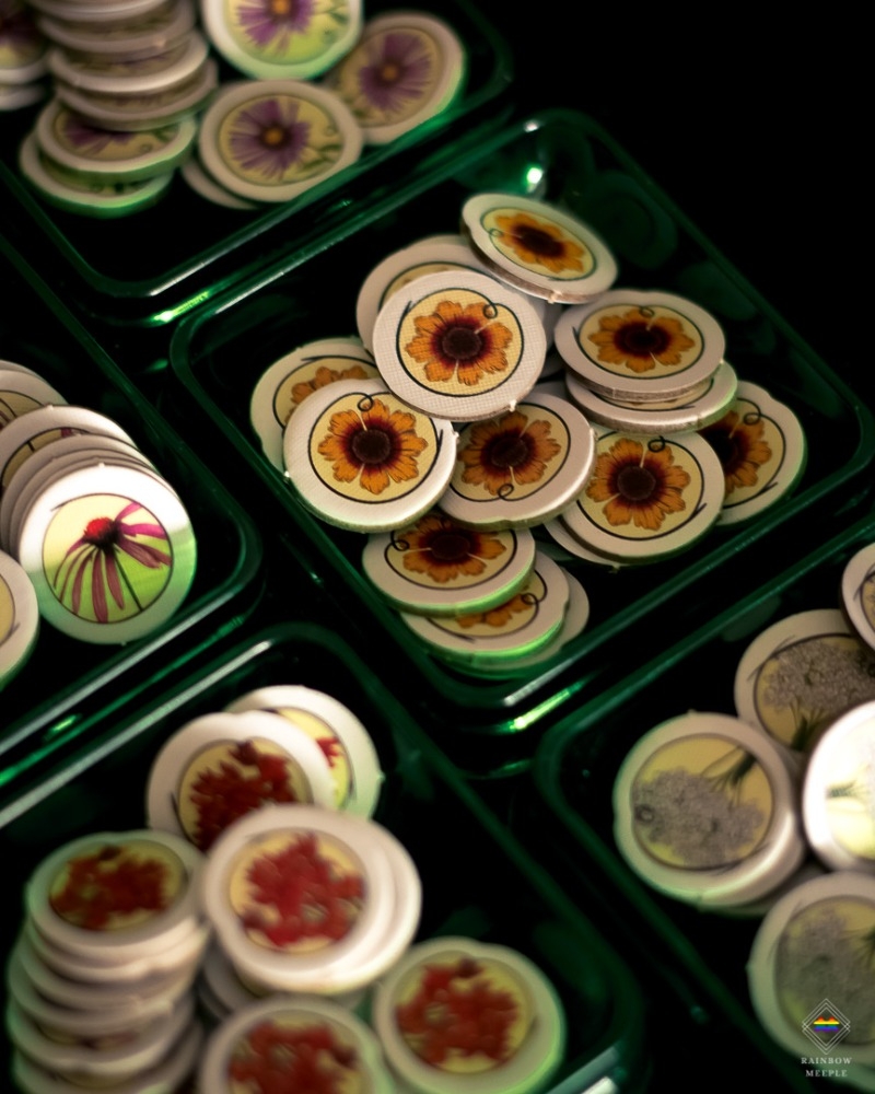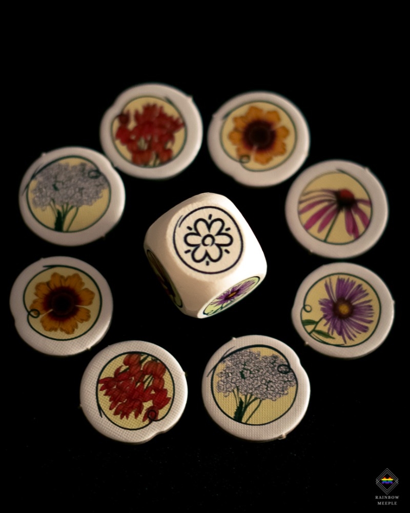 Dado e tokens de flores - @rainbow_meeple Mariposas