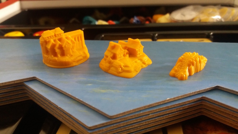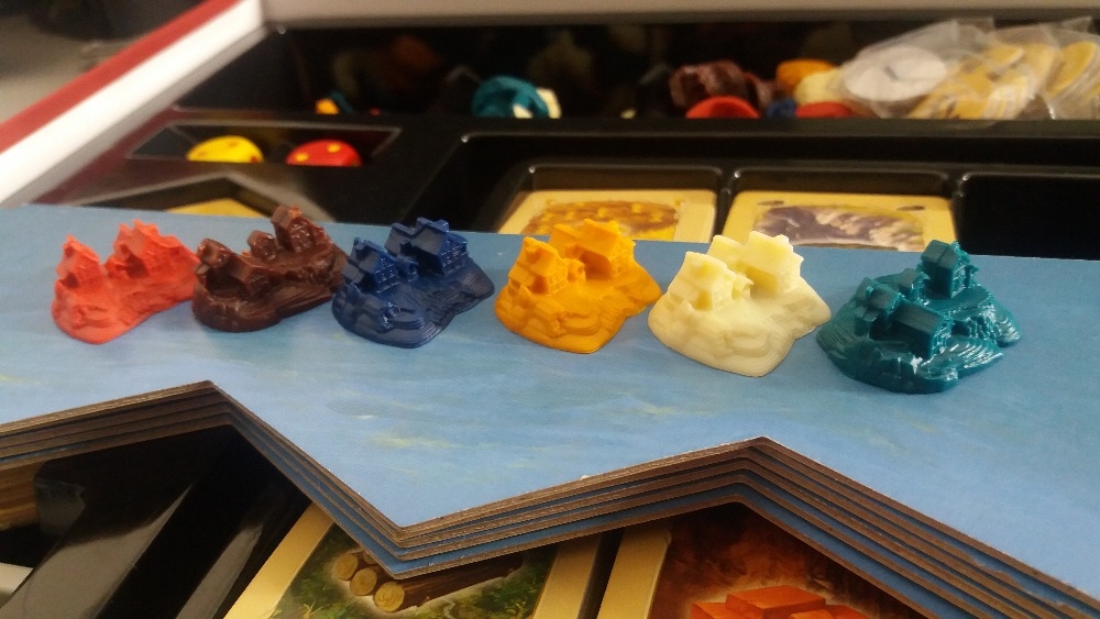 Tokens de herói (machado) e de comércio (balança) Rivals for Catan: Deluxe