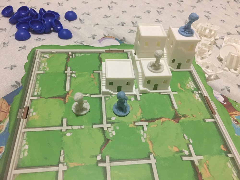 PnP home made do Santorini com peças em madeira de construção reaproveitada. Variações de altura e cores dos andares e domo para facilitar identificação pelos jogadores. Santorini