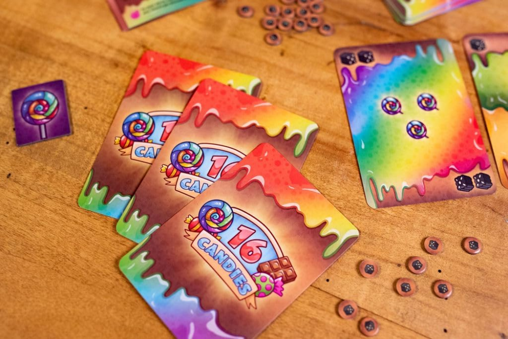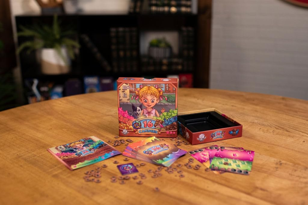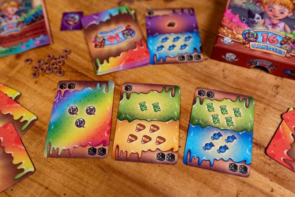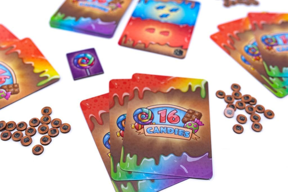 O jogo termina quando apenas um jogador tiver doces em seu estoque, e esse jogador é o vencedor. Com voltas rápidas e um tema divertido, 16 Candies é uma guloseima saborosa para as noites de jogo com a família e amigos.