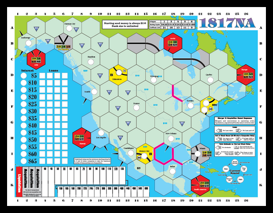 Esta é uma variante de 1817 e o 1817 é necessário para jogá-lo. Tem menos hexágonos e tempo de jogo mais curto do que 1817, mas como um twist que abrange toda a América do Norte. Muitas cidades existentes tiveram que ser excluídas para fins de equilíbrio, pode ser conveniente considerar as cidades como zonas populacionais. Obrigado a Craig Bartell e Tim Flowers por criarem 1817, um dos meus jogos 18xx favoritos.