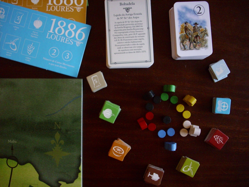 Componentes, cartas e tabuleiro de jogador e tabuleiro