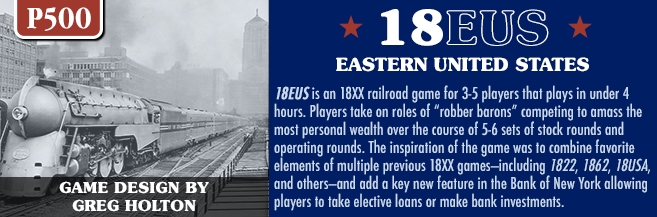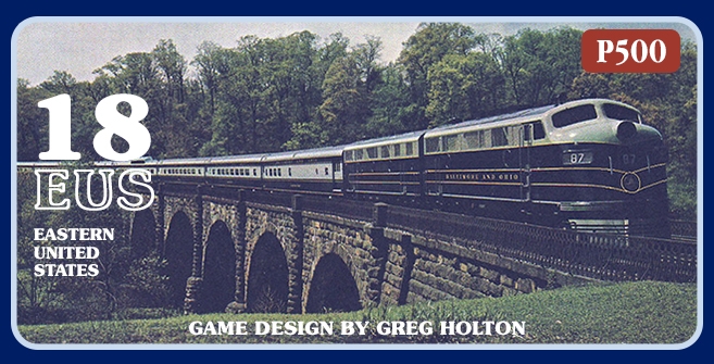 18EUS é um jogo ferroviário 18XX para 3-5 jogadores que joga em menos de 4 horas. Os jogadores assumem o papel de "barões ladrões" competindo para acumular a maior riqueza pessoal ao longo de 5-6 conjuntos de rodadas de ações e rodadas operacionais. A inspiração do jogo foi combinar elementos favoritos de vários jogos 18XX anteriores - incluindo 1822, 1862, 18USA e outros - e adicionar um novo recurso importante no Bank of New York, permitindo aos jogadores fazer empréstimos opcionais ou fazer investimentos bancários. A força relativa dos empréstimos versus investimentos bancários é dinâmica e dependente das ações de outros jogadores. 18EUS também apresenta uma tremenda variabilidade pré-jogo, mas zero aleatoriedade no jogo. Os jogadores devem avaliar as estratégias com base na configuração pré-jogo e nas ações e reações potenciais de outros jogadores para obter sucesso.