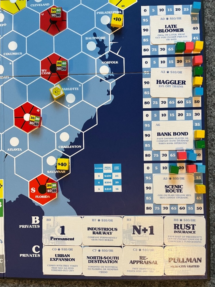 18EUS apresenta fortes empresas privadas leiloadas em três rodadas. Essas empresas privadas não possuem valor intrínseco, mas podem ter fortes efeitos sobre as empresas ferroviárias e o Banco de Nova York. Um total de 30 empresas privadas estão divididas em três tranches para as três rodadas de leilões. Cada rodada apresenta uma empresa privada fixa e três empresas privadas escolhidas aleatoriamente da parcela, portanto, um total de 12 das 30 empresas privadas estão presentes em cada jogo. Uma empresa privada especial, a "Late Bloomer", tem efeito mínimo até o final do jogo, quando pode ser trocada por uma grande quantia em dinheiro ou por qualquer uma das empresas privadas não utilizadas. O mecanismo de leilão é semelhante ao de 1822, embora os jogadores possam fazer lances em todas as quatro empresas privadas. Estratégias e sinergias não faltam!