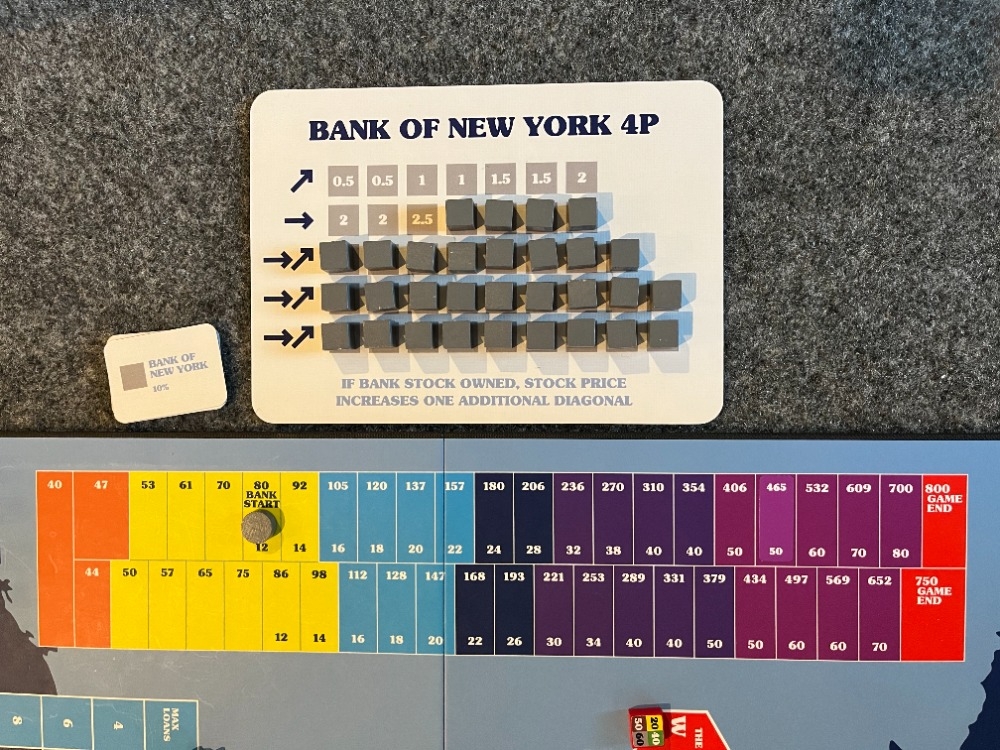 O Banco de Nova York é o principal fator distintivo da 18EUS . Os jogadores, não as empresas, podem fazer empréstimos pessoais durante as rodadas de ações para financiar seus investimentos. Esses empréstimos são representados como cubos que saem da carta do Banco de Nova York. Alternativamente, se os jogadores não tiverem empréstimos, eles podem comprar ações do banco. O banco "opera" no final de cada rodada operacional: os jogadores que possuem empréstimos devem pagar juros, os jogadores que possuem ações do banco recebem dividendos e o preço das ações do banco (e princípio do empréstimo) aumenta. O desempenho do banco é melhor - e os empréstimos são piores - quando mais empréstimos são retirados do contrato e quando alguém possui uma ação do banco.