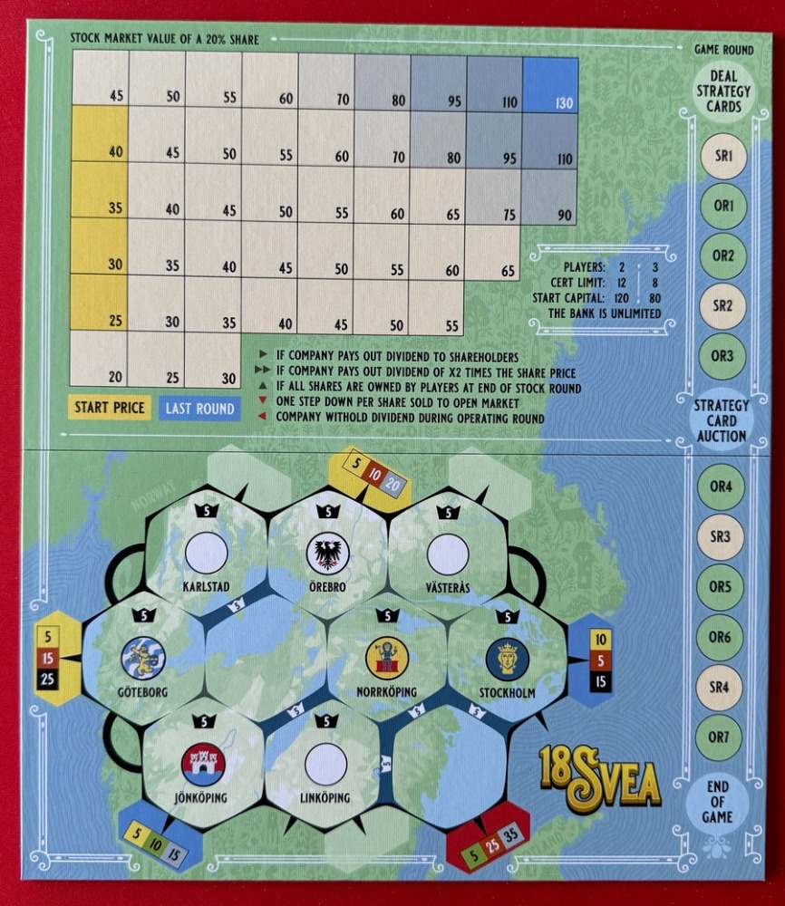 Um jogo de 18Svea acontece durante uma série de rodadas de ações (SR), quando os jogadores gerenciam seus investimentos nas cinco empresas; e rodadas operacionais (OR), quando as empresas ferroviárias pertencentes aos jogadores expandem sua rede ferroviária, estabelecem estações, operam trens e geram dinheiro para seus acionistas. Quando o jogo termina após um total de quatro SRs e sete ORs, o jogador com a maior riqueza combinada em dinheiro e ações da empresa vence.