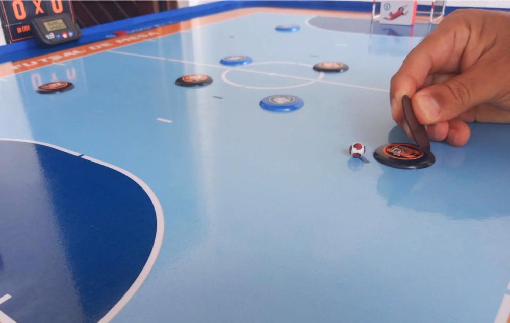 Jogador usa a palheta para realizar a ação de chute na quadra de Futsal de Mesa (Futsal de Botão).