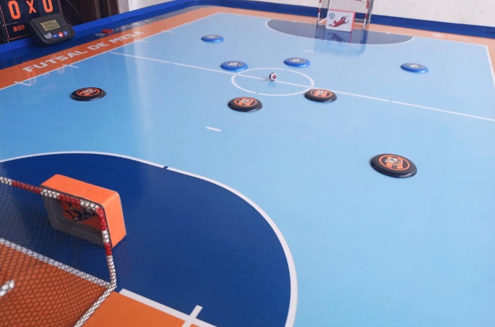 Visão dos botões posicionados antes do inicio do jogo de Futsal de Mesa (Futsal de Botão).