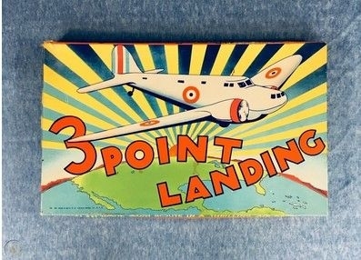 Distribua as cartas de destino igualmente entre todos os jogadores. Cada jogador também recebe uma figura que representa seu avião. O objetivo do “THREE POINT LANDING” é cobrir todas as cidades listadas em suas cartas de destino e depois retornar ao ponto de partida, ou seja, “LaGuardia Field” New York City, antes de seus oponentes. Quem retornar primeiro é o vencedor, antes de começar, estude suas cartas de rota e o mapa para determinar a rota de ida e volta mais curta e organize suas cartas de acordo. Os jogadores giram o dial por sua vez e se movem ao longo da rota desejada, avançando a mesma quantidade de espaços que o giro. Ele deve pousar em todas as cidades listadas nas cartas, mesmo que gire um número maior. (Exemplo: se ele está a três espaços de uma de suas cidades e gira um seis, ele ainda avança apenas três espaços para a cidade e então espera seu próximo turno.) Imagem “MOTOR REPARING” - ---em vermelho clolor --- o jogador deve retornar à última cidade numerada, é necessário girar o número exato de espaços para LaGuardia Field, New York City, a fim de pousar lá no final . (Exemplo: se sobrarem três espaços no campo, um três deve ser girado para pousar lá.) As cidades no mapa têm números que correspondem aos números nas cartas de destino, para que crianças pequenas não tenham dificuldade na identificação da posição das cidades no mapa.