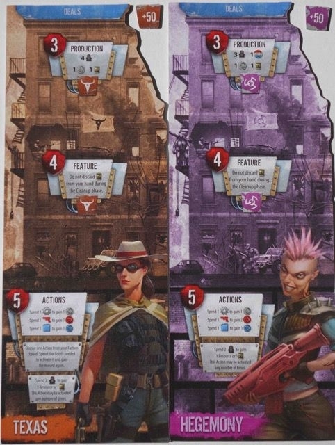 2 novas facções para o jogo base. O Texas fornece um trabalhador extra na produção e converte todos os três recursos em uma proporção de 1:1 em tokens de contato. (Mas você pode escolher uma dessas três ações uma segunda vez por rodada.) A hegemonia fornece um token de contato selvagem extra na produção e converte recursos cinza e azul em uma proporção de 1:1, recursos vermelhos 1:2. (Como de costume, cada um apenas uma vez por rodada.)