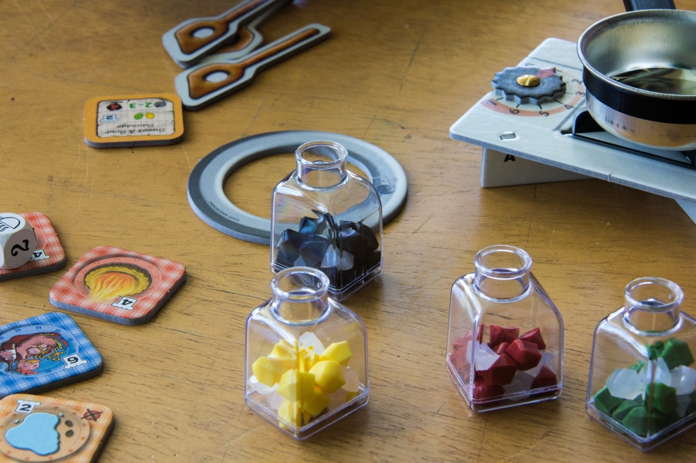 O aquecimento de seu forno é um assunto aleatório resolvido com um dado, e pode aumentar o calor no forno de todos. Temperar o prato é o coração do jogo e é feito com pequenas garrafas cheias de pequenos aglomerados de madeira coloridas. Quando as bolinhas caem fora da garrafa, o número de pellets não pode exceder dois, porque o excesso de tempero fará o prato em ruínas e você tem que jogá-lo no lixo!