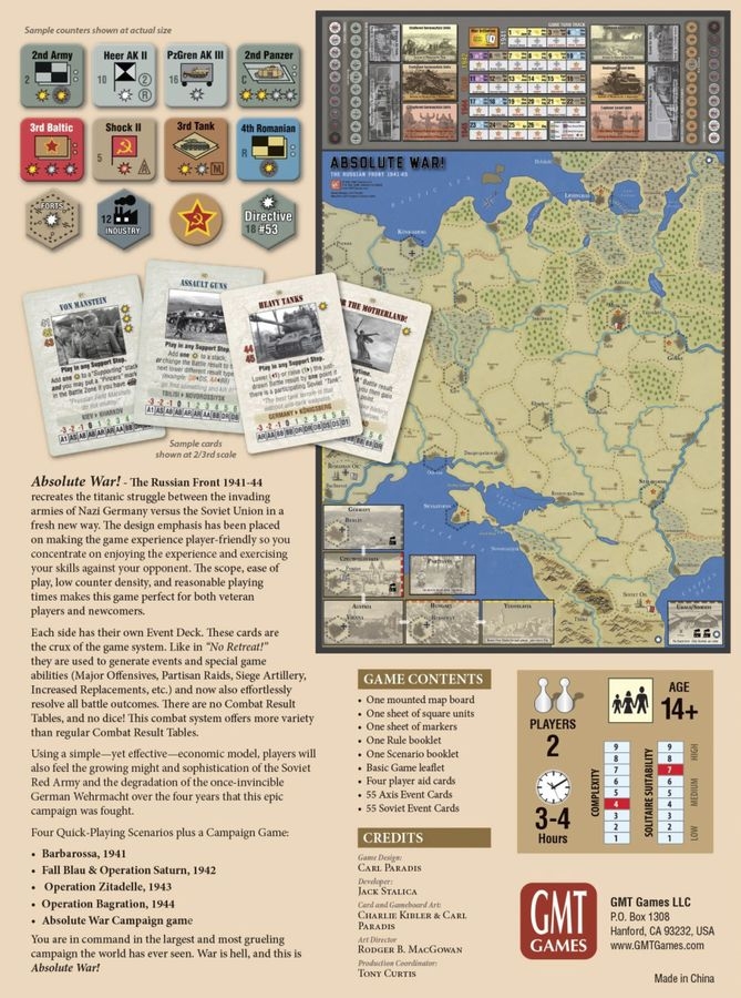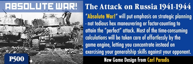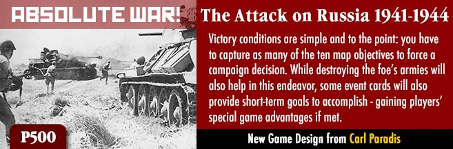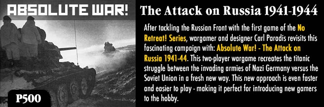 "Depois de enfrentar a Frente Russa com o primeiro jogo da No Retreat! Series, o wargamer e designer Carl Paradis revisita esta campanha fascinante com: Absolute War! - O Ataque à Rússia 1941-44. Este jogo de guerra para dois jogadores recria a luta titânica entre os exércitos invasores da Alemanha nazista contra a União Soviética de uma nova maneira. Esta nova abordagem é ainda mais rápida e mais fácil de jogar - tornando-se perfeito para introduzir novos jogadores para o hobby.
