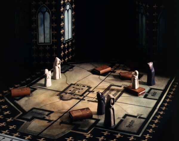 O cenário é um mosteiro medieval.
