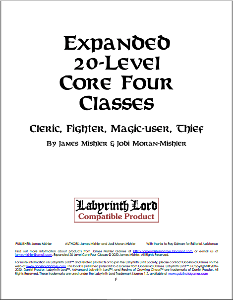 As quatro classes principais expandidas de 20 níveis fornecem uma versão nova e expandida de cada uma das quatro classes principais do Labyrinth Lord, para uso com Labyrinth Lord e Advanced Labyrinth Lord. Na linha do conceito original de “regras complementares” da série BX original, isso dá aos jogadores algo pelo qual ansiar em níveis mais elevados – na verdade, em todos os níveis!