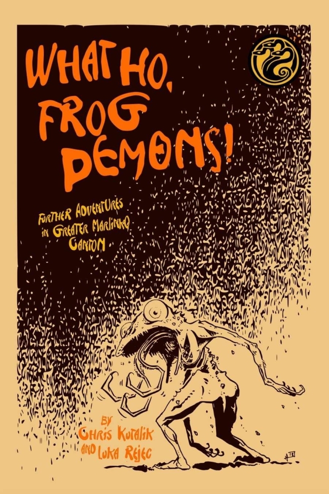Pesando 112 páginas de pura fantasia ácida eslava/vanciana/moorcockiana, What Ho, Frog Demons é a quarta aventura autônoma em mini-sandbox da série Slumbering Ursine Dunes. Fever-Dreaming Marlinko foi um experimento para reformar o livro de cenário da cidade: descartando as partes tediosas e aumentando as qualidades mais aventureiras. What Ho, Frog Demons é uma experiência semelhante: o que acontece quando você acelera um livro de cenário regional muito alto para jogar puro na mesa.