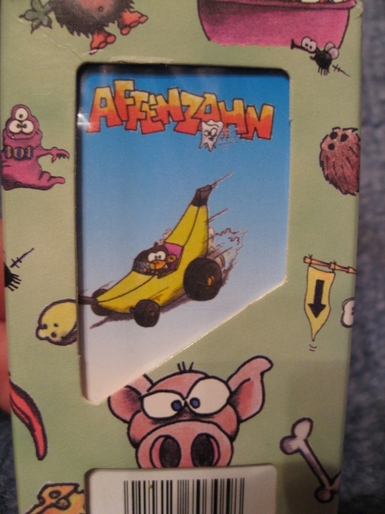 Affenzahn retrata macacos de corrida, usando laranjas como tema de pontuação (faça bem e ganhe laranjas; reaja mal e perca laranjas). Cada jogador recebe quatro cartas, correspondentes a si e aos outros três pilotos do jogo (as regras estão incluídas para 2 e 3 jogadores). Jogadoras