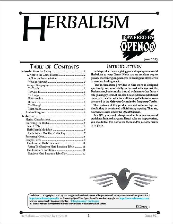 As informações fornecidas neste trabalho são projetadas especificamente, e não oficialmente, para serem usadas com Against the Darkmaster, mas também podem ser usadas com muitos outros sistemas de RPG de fantasia. Também podem ser consideradas como material adicional a ser usado com as diretrizes e regras adicionais apresentadas no Grievous Grimoire por Imaginary Turtles.