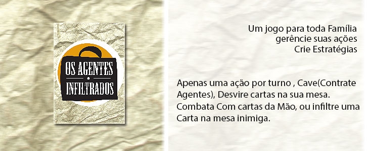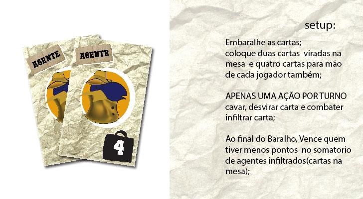 Você tem uma organização secreta, combata agente infiltrados, desvirando cartas na sua mesa, contrate agentes, cavando no monte, ou infiltre agente, colocando cartas na sua mão na mesa.