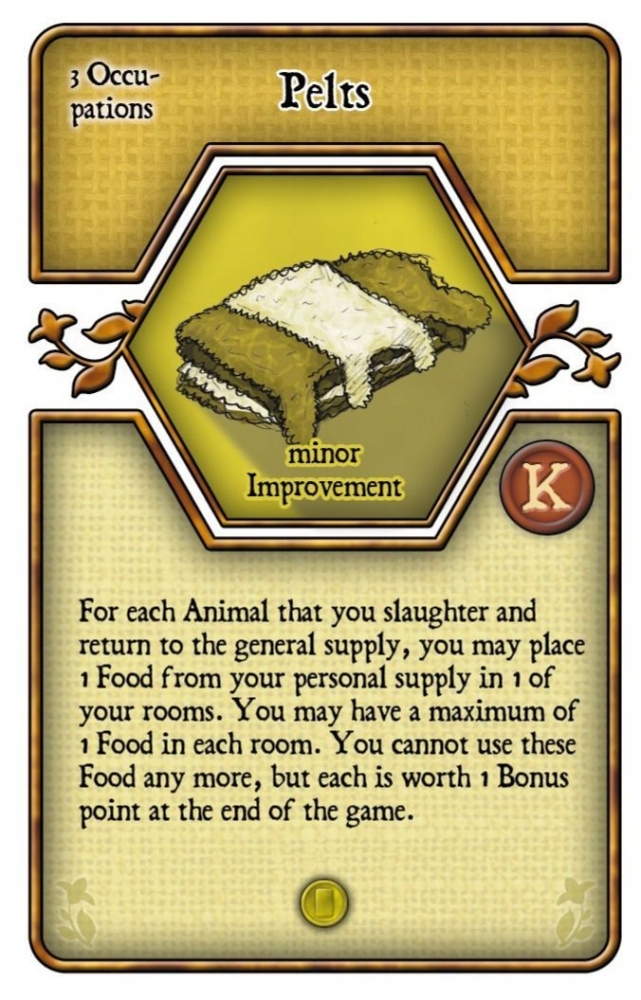 Para cada animal que você abater e devolver ao estoque geral, você pode colocar 1 alimento de seu estoque pessoal em 1 de seus quartos. Você pode ter no máximo 1 Comida em cada quarto. Você não pode mais usar esses alimentos, mas cada um vale 1 ponto de bônus no final do jogo.