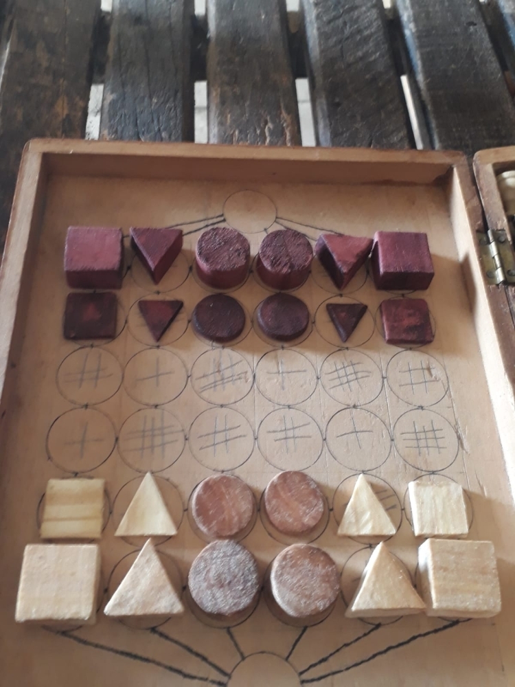 Um tabuleiro 6x6 duas peças de cada tipo/subtipo por cada jogador, os tipos são redondo, quadrado e triângulo, os subtipos são peças grande e pequenas.