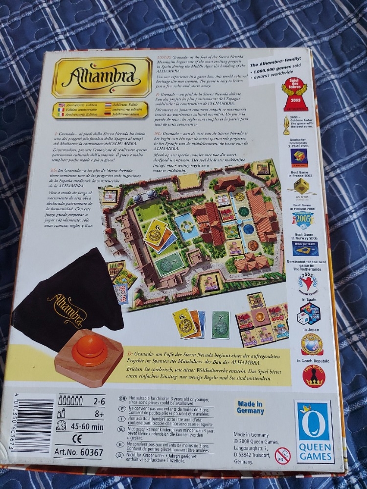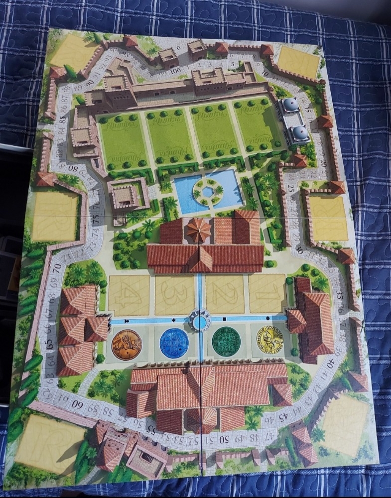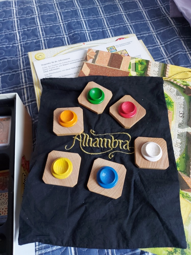 Anniversary Gold Edition - completa com um único grande tabuleiro que incorpora trilha de pontuação, mercado de construção, área de sorteio para cartas e seção de "reserva" para cada jogador. Também inclui Fontes de madeira nas quais você constrói sua Alhambra e meeples personalizados para pontuar. Há também um saco de pano para os tiles.