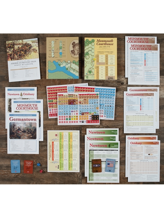 A GMT Games e o designer Mark Miklos têm o prazer de anunciar o tão esperado e aguardado segundo Tri-pack nas premiadas Battles of the American Revolution Series. Você falou e nós ouvimos. Centenas de jogadores responderam a pesquisas realizadas em várias mídias sociais e outros sites e os votos estão dentro. Vocês pediram que Monmouth Courthouse , Germantown e Newtown fossem incluídos no segundo BoAR Tri-pack e estamos orgulhosos de trazê-los para você.