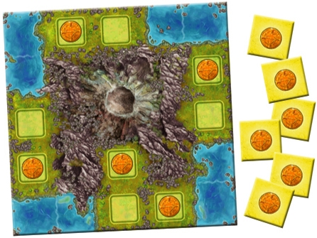 Toda vez que um jogador construir em um desses tiles, ele revela o número no tile e ganha aquela quantidade em ouro. Não é possível construir no vulcão, de acordo com o autor Stefan Feld.