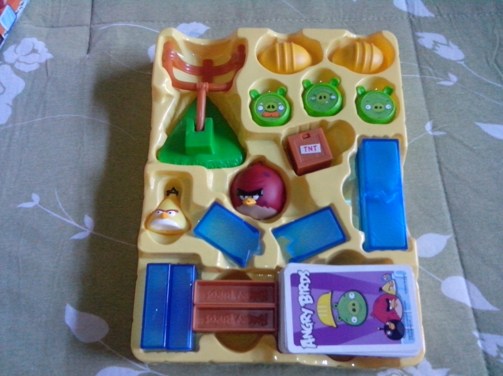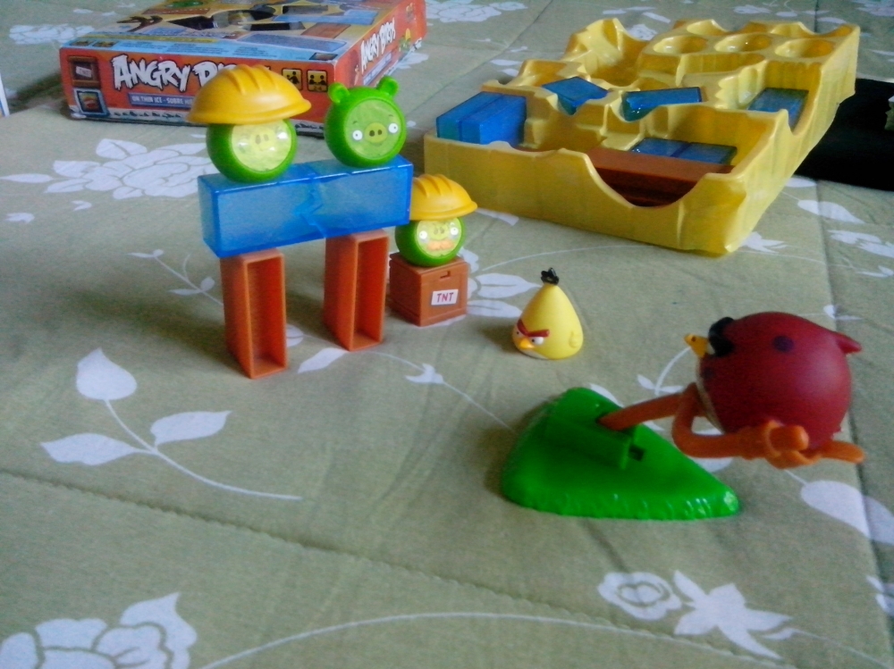 Este brinquedo busca deixar os jogadores construírem, lançarem, e destruírem com novas características, incluindo porcos com capacetes, blocos de construção de gelo quebrável, uma caixa de TNT 'explosiva' e um novo personagem pássaro vermelho. Os jogadores pegam uma carta e constroem a estrutura mostrada antes que o oponente lance os 'Angry Birds' em uma tentativa de derrubar a estrutura - e os porcos - para ganhar pontos.