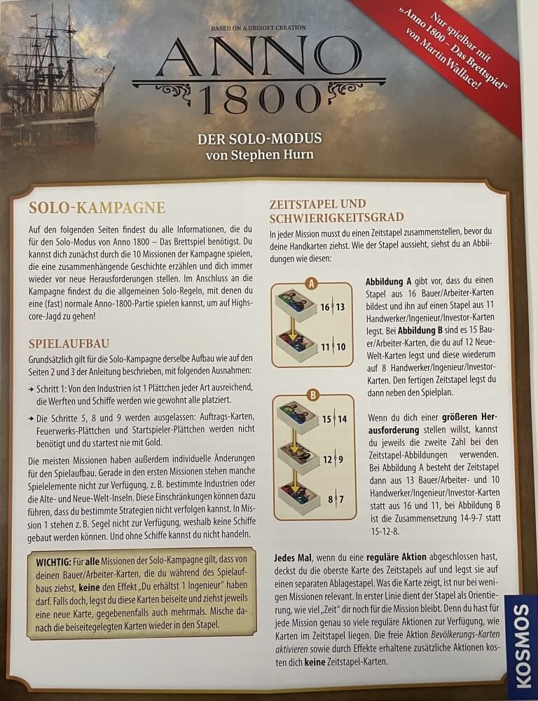 Modo solo para Anno 1800 - The Board Game de Martin Wallace. O jogador pode jogar 10 missões da campanha, que contam uma história coerente e, assim, enfrentar novos desafios repetidamente. Além da campanha, existem regras individuais gerais que podem ser usadas para jogar um jogo Anno 1800 (quase) normal para buscar pontuações mais altas!