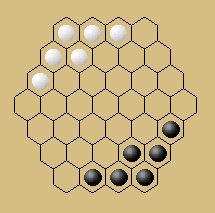 Annuvin é jogado em um tabuleiro hexagonal (37 espaços) com 6 peças por jogador dispostas em cantos opostos.