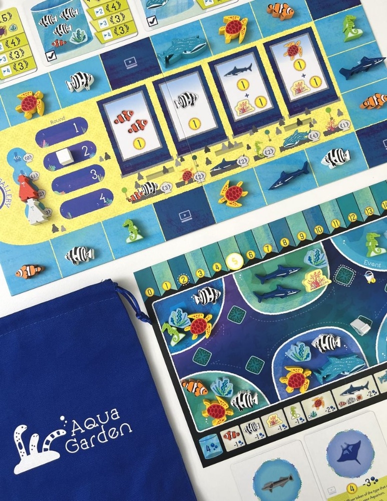 Aqua Garden é um jogo para 1 a 4 jogadores do designer japonês Totsuca Chuo designer de The Artic e Perfumery e é um jogo de coleção de componentes onde os jogadores constroem seu próprio aquário.