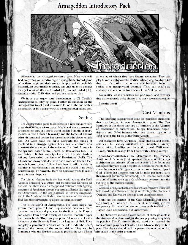 Esperamos que você goste da sua introdução ao RPG Armageddon de CJ Carella. Mais informações sobre a linha de produtos Armageddon podem ser encontradas no final deste pacote de demonstração ou visitando www.edenstudios.net/armageddon.