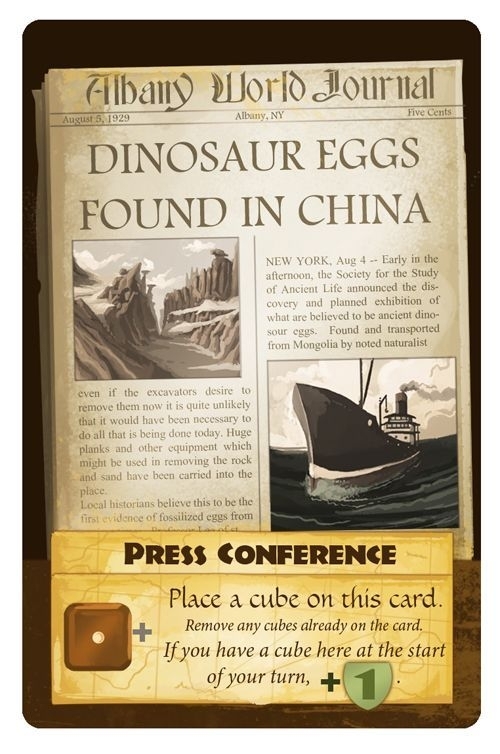 Esta é uma nova carta de ação pública para Artifacts Inc.. Os jogadores podem colocar um cubo aqui, e se o jogador que colocou o cubo ainda tiver o cubo na carta no início de seu turno, ele ganhará um Ponto de Vitória.