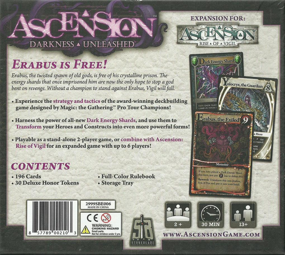 Ascension: Darkness Unleashed é ao mesmo tempo um jogo autônomo para dois jogadores como uma expansão que pode ser combinada com qualquer outro jogo Ascension.