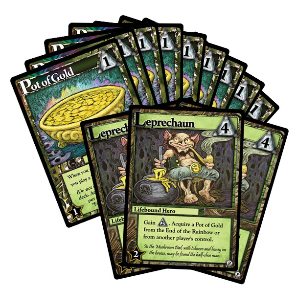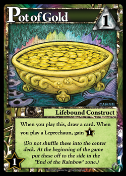 Depois de recrutar o Leprechaun e jogar o mesmo é possível adquirir uma carta de pote de ouro da pilha das mesmas ou de outro jogador. O pote de ouro é um constructo virente e toda vez que se joga um, compra-se uma carta. Além disso, com o Pote de ouro na mesa do jogador, toda vez que ele(a) baixar um Leprechaun ganha 1 ponto de honraria.