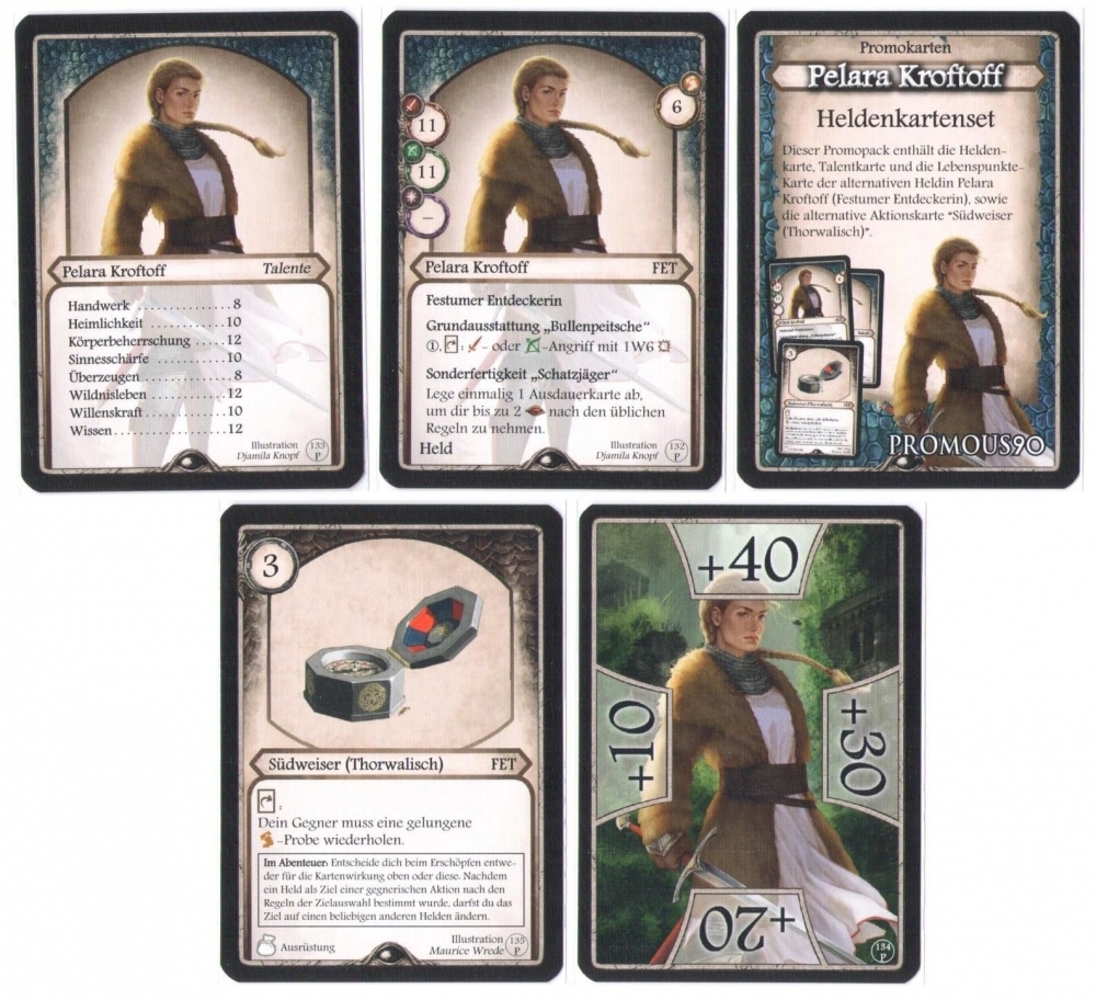 Este pacote promocional contém o cartão de herói, cartão de habilidade, cartão de ponto de vida, cartão de ação "Südweiser (Thorwalisch)" e cartão de regras para o herói alternativo Pelara Kroftoff, Festumian Explorer.