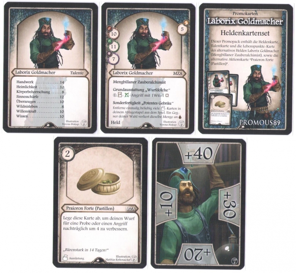 Este pacote promocional contém o cartão de herói, o cartão de habilidade, o cartão de ponto de vida, o cartão de ação "Praioron Forte (Pastillen)" e o cartão de regras para o herói alternativo Laborix Goldmaker, Mengbillian Magical Alchemist.
