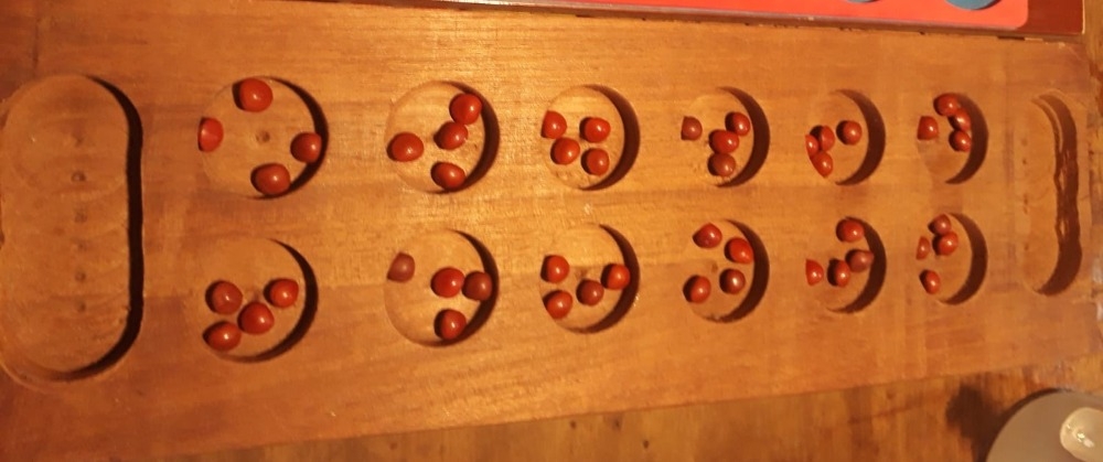 Jogo de Origem Africana uma variante do Mancala, e que embora utilize o mesmo tabuleiro possui uma mecânica de jogo bem diferente o que leva a estratégias particulares.