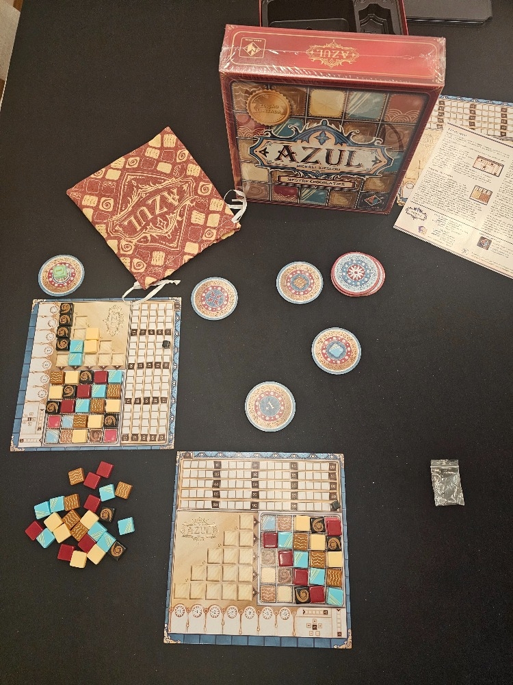 No jogo Azul, os jogadores se revezam comprando peças coloridas de fornecedores para o tabuleiro do jogador. Mais tarde na rodada, os jogadores marcam pontos com base em como colocaram suas peças para decorar o palácio. Pontos extras são marcados para padrões específicos e conjuntos completos; suprimentos desperdiçados prejudicam a pontuação do jogador. O jogador com mais pontos no final do jogo vence.