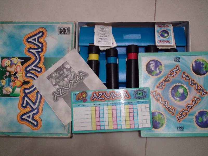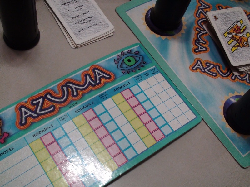 Azuma é um jogo que envolve atenção, ação e agilidade. Assim que alguém grita AZUMA, as cartas são trocadas entre os jogadores. Em cada rodada, uma nova chance pra você formar um quarteto e um trio de cartas com figuras iguais. Com elas na mão agarre um bastão sem que ninguém perceba. Quando os outros notarem, terão que ser rápidos, porque quem ficar sem bastão não marca pontos.