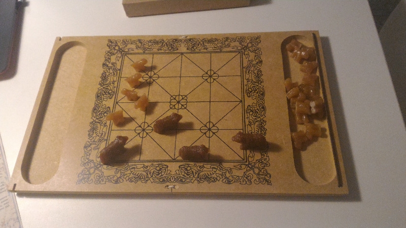 O mais surpreendente neste jogo é que cada parte possui um número diferente de peças e uma condição de jogo diferente, mas ainda assim consegue ser equilibrado. Distinto do xadrez e do jogo de damas, mas contendo elementos destes jogos, as peças são posicionadas nas intersecções das linhas e não nas áreas delimitadas por elas e, movem-se pelas linhas.