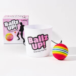 Prenda o copo à cintura com a tira de náilon e tente balançar a bola de espuma com um movimento de impulso.