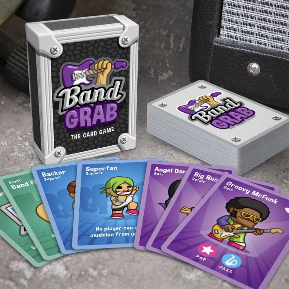 Band Grab é um jogo de cartas de estratégia com tema de música em ritmo acelerado, onde os jogadores correm para coletar um conjunto vencedor de cartas de músicos da moda para sua banda.