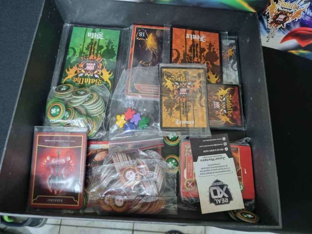 Jogo para 2 a 5 jogadores, faixa etaria acima de 14 anos, alem das cartas, conta com 5 peças personagens (aventureiros), 60 contadores de energia e 60 contadores de dano, mais o livro de manual de regras.