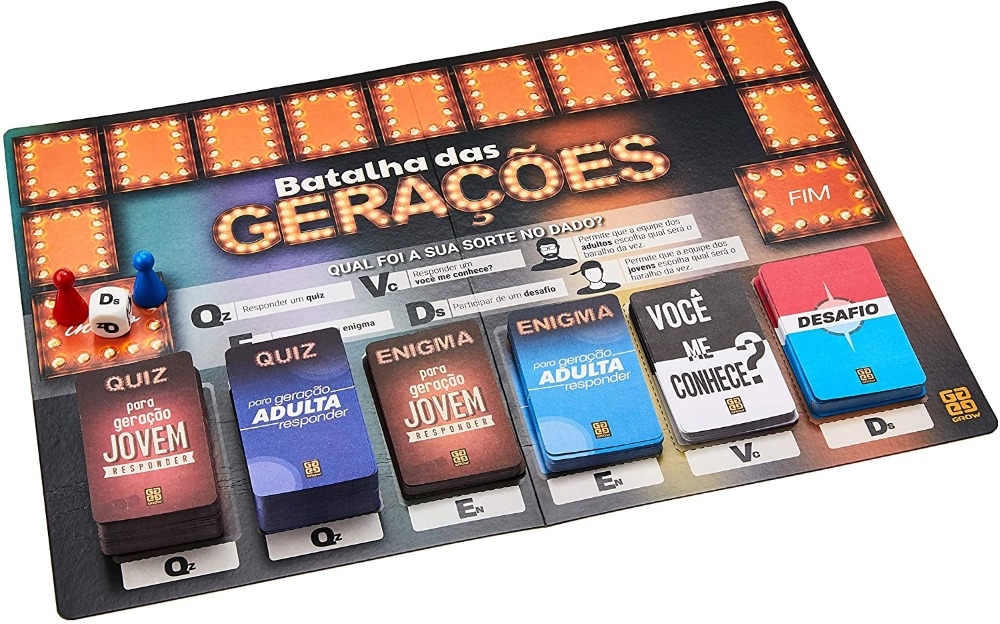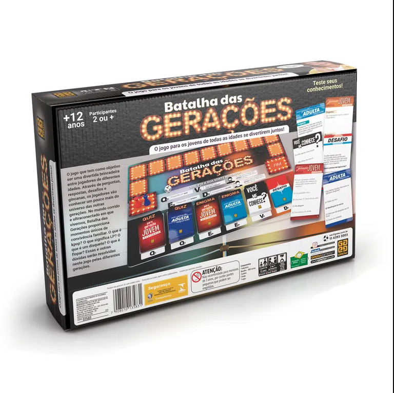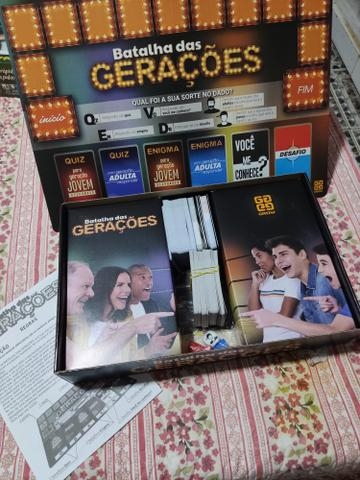 O jogo que tem como objetivo ser uma divertida brincadeira entre jogadores de diferentes idades. Através de perguntas, respostas, desafios e gincanas, os jogadores vão conhecer um pouco mais do universo das outras gerações. No mundo corrido e ultra conectado em que vivemos, Batalha das Gerações proporciona momentos únicos de convivência familiar. O que é Kpop? O que significa LP? O que é flopar? Essas e outras dúvidas serão resolvidas neste jogo pelas diferentes gerações.